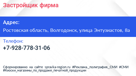 Застройщик, фирма по адресу Ростовская область, Волгодонск, улица Энтузиастов, 8а в дальнейшем Организация, размещена в следующих категориях: