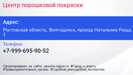Центр порошковой покраски по адресу Ростовская область, Волгодонск, проезд Натальина Роща, 1 в дальнейшем Организация, размещена в следующих категориях: