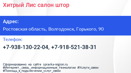 Хитрый Лис, салон штор по адресу Ростовская область, Волгодонск, Горького, 90 в дальнейшем Организация, размещена в следующих категориях: