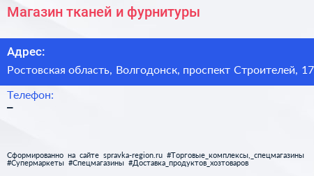 Магазин тканей и фурнитуры по адресу Ростовская область, Волгодонск, проспект Строителей, 17 в дальнейшем Организация, размещена в следующих категориях: