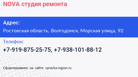 NOVA, студия ремонта по адресу Ростовская область, Волгодонск, Морская улица, 92 в дальнейшем Организация, размещена в следующих категориях: