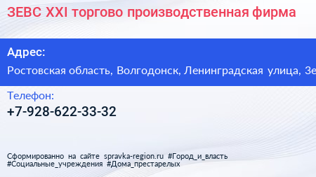 ЗЕВС XXI, торгово-производственная фирма по адресу Ростовская область, Волгодонск, Ленинградская улица, 3е в дальнейшем Организация, размещена в следующих категориях:
