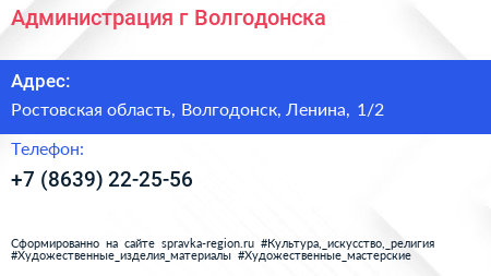 Администрация г. Волгодонска по адресу Ростовская область, Волгодонск, Ленина, 1/2 в дальнейшем Организация, размещена в следующих категориях: