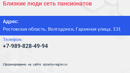 Близкие люди, сеть пансионатов по адресу Ростовская область, Волгодонск, Гаражная улица, 131 в дальнейшем Организация, размещена в следующих категориях: