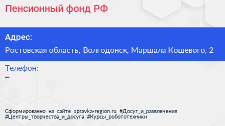 Пенсионный фонд РФ по адресу Ростовская область, Волгодонск, Маршала Кошевого, 2 в дальнейшем Организация, размещена в следующих категориях: