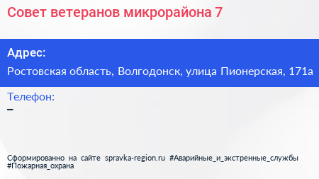Совет ветеранов микрорайона №7 по адресу Ростовская область, Волгодонск, улица Пионерская, 171а в дальнейшем Организация, размещена в следующих категориях: