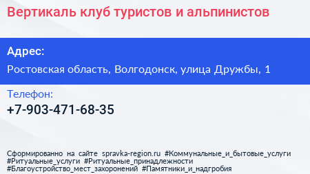 Вертикаль, клуб туристов и альпинистов по адресу Ростовская область, Волгодонск, улица Дружбы, 1 в дальнейшем Организация, размещена в следующих категориях: