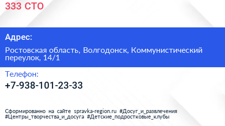 333, СТО по адресу Ростовская область, Волгодонск, Коммунистический переулок, 14/1 в дальнейшем Организация, размещена в следующих категориях: