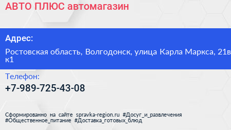 АВТО ПЛЮС, автомагазин по адресу Ростовская область, Волгодонск, улица Карла Маркса, 21в к1 в дальнейшем Организация, размещена в следующих категориях: