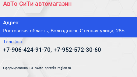 АвТо-СиТи, автомагазин по адресу Ростовская область, Волгодонск, Степная улица, 28Б в дальнейшем Организация, размещена в следующих категориях:
