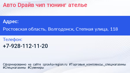 Aвто Dрайв, чип-тюнинг-ателье по адресу Ростовская область, Волгодонск, Степная улица, 118 в дальнейшем Организация, размещена в следующих категориях: