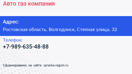 Авто газ, компания по адресу Ростовская область, Волгодонск, Степная улица, 32 в дальнейшем Организация, размещена в следующих категориях: