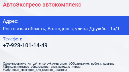 АвтоЭкспресс, автокомплекс по адресу Ростовская область, Волгодонск, улица Дружбы, 1а/1 в дальнейшем Организация, размещена в следующих категориях: