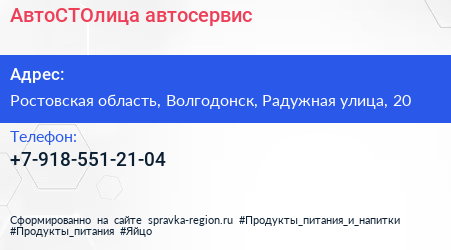 АвтоСТОлица, автосервис по адресу Ростовская область, Волгодонск, Радужная улица, 20 в дальнейшем Организация, размещена в следующих категориях:
