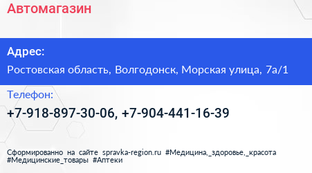 Автомагазин по адресу Ростовская область, Волгодонск, Морская улица, 7а/1 в дальнейшем Организация, размещена в следующих категориях: