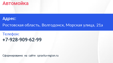 Автомойка по адресу Ростовская область, Волгодонск, Морская улица, 21а в дальнейшем Организация, размещена в следующих категориях: