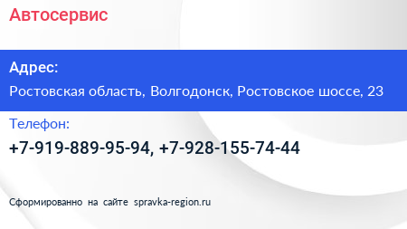 Автосервис по адресу Ростовская область, Волгодонск, Ростовское шоссе, 23 в дальнейшем Организация, размещена в следующих категориях: