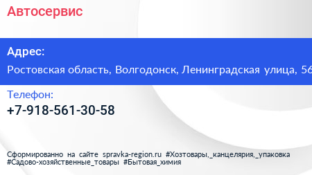 Автосервис по адресу Ростовская область, Волгодонск, Ленинградская улица, 56 в дальнейшем Организация, размещена в следующих категориях: