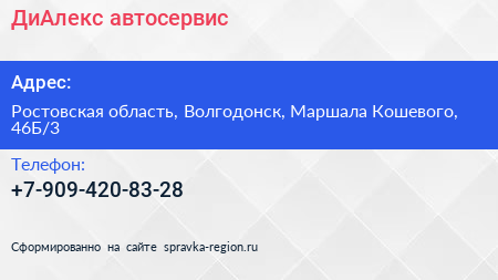 ДиАлекс, автосервис по адресу Ростовская область, Волгодонск, Маршала Кошевого, 46Б/3 в дальнейшем Организация, размещена в следующих категориях: