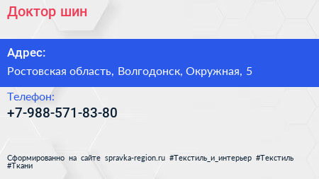 Доктор шин по адресу Ростовская область, Волгодонск, Окружная, 5 в дальнейшем Организация, размещена в следующих категориях: