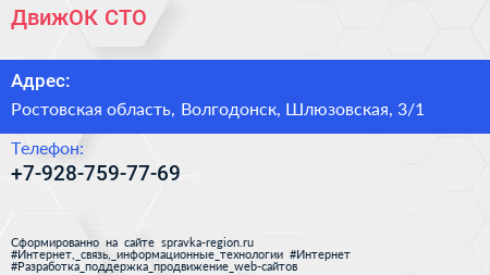 ДвижОК, СТО по адресу Ростовская область, Волгодонск, Шлюзовская, 3/1 в дальнейшем Организация, размещена в следующих категориях: