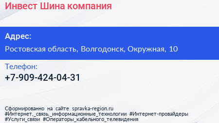 Инвест Шина, компания по адресу Ростовская область, Волгодонск, Окружная, 10 в дальнейшем Организация, размещена в следующих категориях: