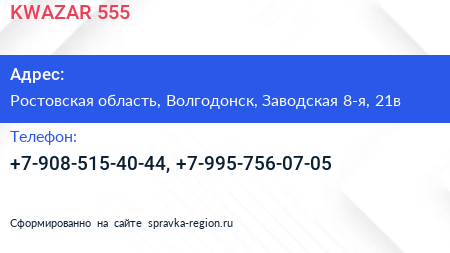 KWAZAR 555 по адресу Ростовская область, Волгодонск, Заводская 8-я, 21в в дальнейшем Организация, размещена в следующих категориях: