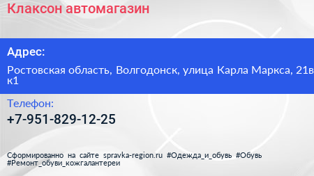Клаксон, автомагазин по адресу Ростовская область, Волгодонск, улица Карла Маркса, 21в к1 в дальнейшем Организация, размещена в следующих категориях: