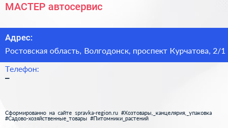 МАСТЕР, автосервис по адресу Ростовская область, Волгодонск, проспект Курчатова, 2/1 в дальнейшем Организация, размещена в следующих категориях: