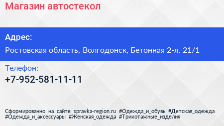 Магазин автостекол по адресу Ростовская область, Волгодонск, Бетонная 2-я, 21/1 в дальнейшем Организация, размещена в следующих категориях:
