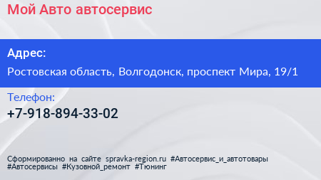 Мой Авто, автосервис по адресу Ростовская область, Волгодонск, проспект Мира, 19/1 в дальнейшем Организация, размещена в следующих категориях: