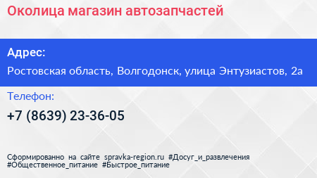 Околица, магазин автозапчастей по адресу Ростовская область, Волгодонск, улица Энтузиастов, 2а в дальнейшем Организация, размещена в следующих категориях: