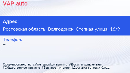 VAP-auto по адресу Ростовская область, Волгодонск, Степная улица, 16/9 в дальнейшем Организация, размещена в следующих категориях: