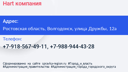 Hart, компания по адресу Ростовская область, Волгодонск, улица Дружбы, 12а в дальнейшем Организация, размещена в следующих категориях: