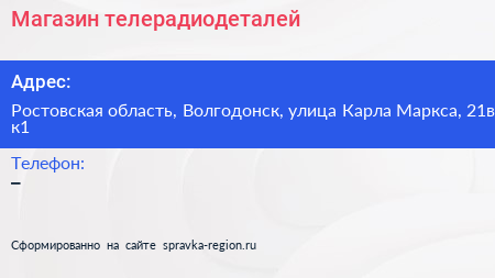 Магазин телерадиодеталей по адресу Ростовская область, Волгодонск, улица Карла Маркса, 21в к1 в дальнейшем Организация, размещена в следующих категориях: