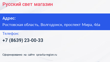 Русский свет, магазин по адресу Ростовская область, Волгодонск, проспект Мира, 46а в дальнейшем Организация, размещена в следующих категориях: