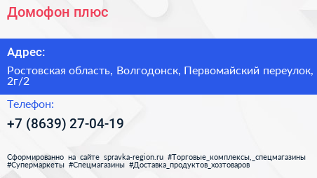 Домофон плюс по адресу Ростовская область, Волгодонск, Первомайский переулок, 2г/2 в дальнейшем Организация, размещена в следующих категориях: