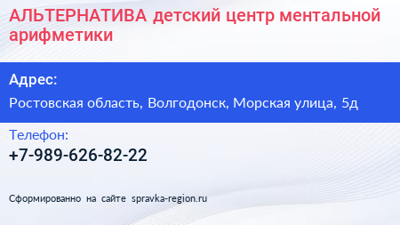 АЛЬТЕРНАТИВА, детский центр ментальной арифметики по адресу Ростовская область, Волгодонск, Морская улица, 5д в дальнейшем Организация, размещена в следующих категориях: