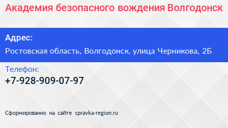 Академия безопасного вождения-Волгодонск по адресу Ростовская область, Волгодонск, улица Черникова, 2Б в дальнейшем Организация, размещена в следующих категориях: