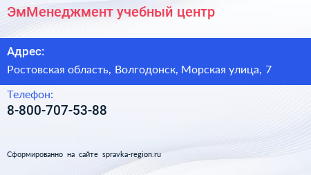 ЭмМенеджмент, учебный центр по адресу Ростовская область, Волгодонск, Морская улица, 7 в дальнейшем Организация, размещена в следующих категориях: