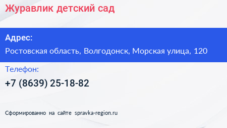 Журавлик, детский сад по адресу Ростовская область, Волгодонск, Морская улица, 120 в дальнейшем Организация, размещена в следующих категориях: