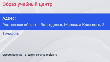 Образ, учебный центр по адресу Ростовская область, Волгодонск, Маршала Кошевого, 3 в дальнейшем Организация, размещена в следующих категориях: