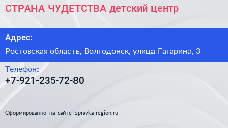 СТРАНА ЧУДЕТСТВА, детский центр по адресу Ростовская область, Волгодонск, улица Гагарина, 3 в дальнейшем Организация, размещена в следующих категориях: