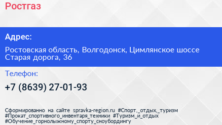 Ростгаз по адресу Ростовская область, Волгодонск, Цимлянское шоссе Старая дорога, 36 в дальнейшем Организация, размещена в следующих категориях: