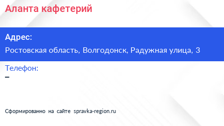 Аланта, кафетерий по адресу Ростовская область, Волгодонск, Радужная улица, 3 в дальнейшем Организация, размещена в следующих категориях: