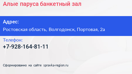 Алые паруса, банкетный зал по адресу Ростовская область, Волгодонск, Портовая, 2а в дальнейшем Организация, размещена в следующих категориях: