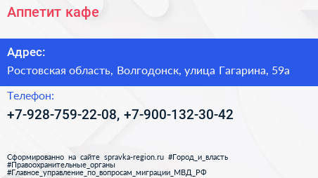 Аппетит, кафе по адресу Ростовская область, Волгодонск, улица Гагарина, 59а в дальнейшем Организация, размещена в следующих категориях: