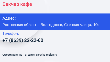 Бакчар, кафе по адресу Ростовская область, Волгодонск, Степная улица, 10а в дальнейшем Организация, размещена в следующих категориях: