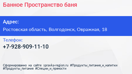 Банное Пространство, баня по адресу Ростовская область, Волгодонск, Овражная, 18 в дальнейшем Организация, размещена в следующих категориях: