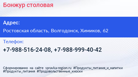 Бонжур, столовая по адресу Ростовская область, Волгодонск, Химиков, 62 в дальнейшем Организация, размещена в следующих категориях: